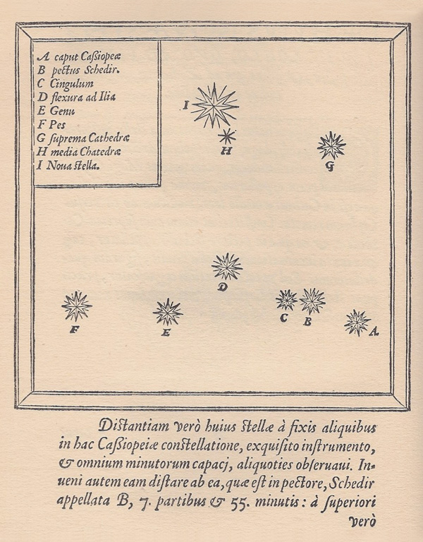 Ilustración incluida por Tycho Brahe en su publicación sobre la aparición de la nueva estrella, señalada con la letra I entre las demás estrellas de la constelación de Casiopea.