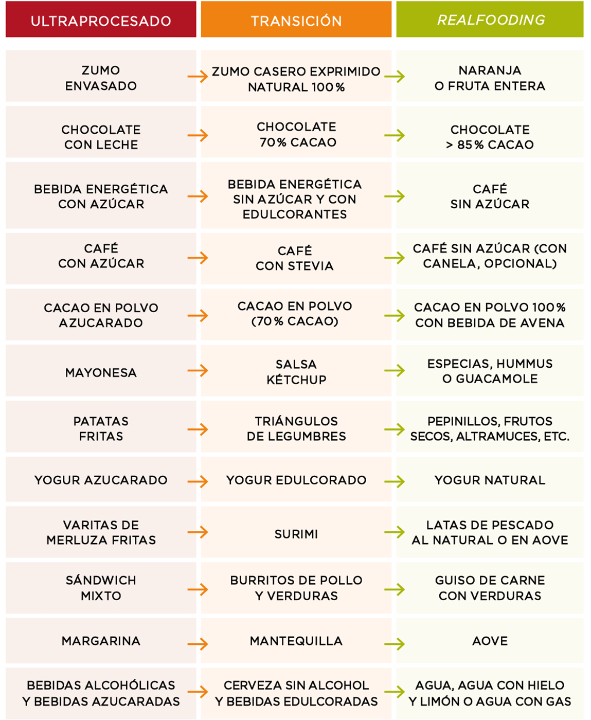 Para ayudarte a que no te desesperes, en la página siguiente te dejo un par de cambios transicionales hacia el Realfooding. Utilízalos de forma práctica para llegar a tu objetivo de comer comida real en un 90 % sin tirar la toalla antes de tiempo.