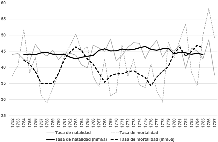 [17]. La tasa de natalidad que resulta para 1787 de una muestra mucho más grande (106 localidades) es aún más alta: 45,6 por mil. La tasa de mortalidad en el decenio 1861-1870 se situó en torno al 34,2 por mil (Instituto Geográfico y Estadístico, 1877) y en el primer quinquenio del siglo xx había descendido al 28,4 por mil (Instituto Nacional de Estadística, 1958).
