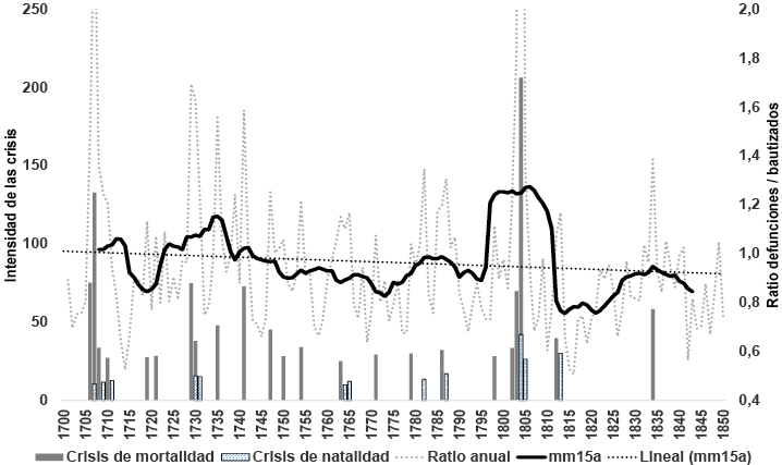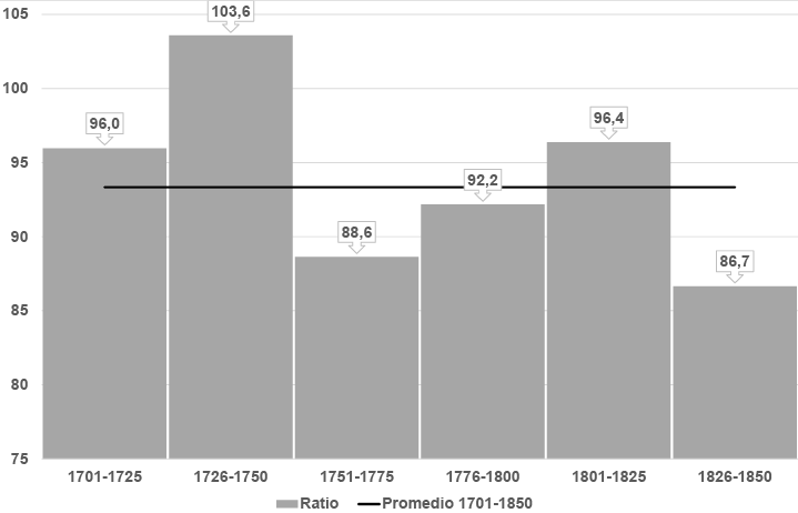 [41]. Como se ha señalado más arriba, estos intervalos son discutibles porque excluyen una fase del ciclo crítico asociado a la guerra de la Independencia, pero incluyen el periodo inmediatamente posterior en el que se produjo un repunte de la natalidad, lo que sesga la ratio a la baja.
