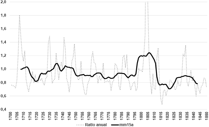 [22]. Siempre que no hubiera crisis entre 1701 y 1705, ya que en realidad el primer tramo sólo abarca los años 1706-1725. Si recalculamos el valor del índice de 1701-1725 para ajustarlo a 25 años, entonces sería un 16% superior al de 1801-1825.