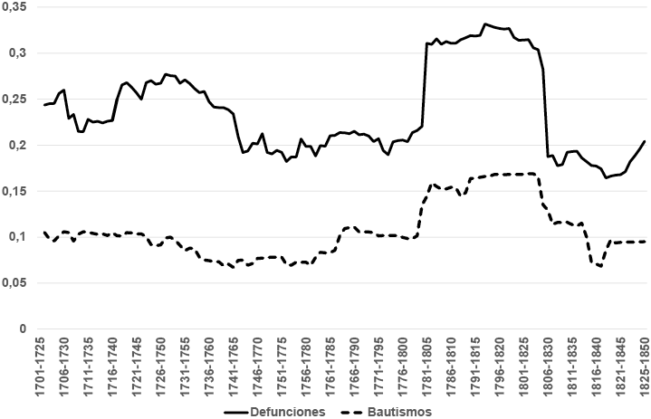 En los últimos años se han publicado varios estudios similares referidos a otras provincias[2]. La principal conclusión de los mismos es que entre 1700-1749 y 1815-1864 la mortalidad –estimada mediante una ratio defunciones/bautizados– disminuyó en la España interior, a veces en proporciones muy considerables: un 30,6% en Zamora, un 22,6% en Palencia, un 22,1% en Ávila, un 17,8% en Guadalajara, un 17,4% en Burgos y en torno al 15% en Albacete y Ciudad Real. Dicho descenso, que se asocia a una supuesta primera fase de la transición demográfica, se concentró en todos los casos en los componentes de mortalidad «ordinaria» y mortalidad de «adultos» (contrapuestos a los de mortalidad «catastrófica» o «extraordinaria» y de «párvulos», respectivamente). De momento, en los trabajos publicados, la constatación de la caída de la mortalidad no va acompañada de una explicación satisfactoria de dicho fenómeno más allá de la formulación de algunas conjeturas, si bien se apunta a que «la caída de la mortalidad en la segunda mitad del Setecientos sugiere que el crecimiento y los cambios económicos en ese periodo fueron algo mayores de los generalmente indicados por la historiografía»[3].