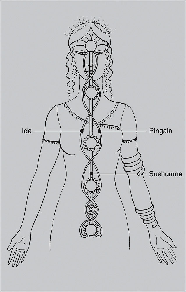 De los setenta y dos mil nadi legados por la tradición, tres revisten una importancia fundamental. Se trata del canal central Sushumna, en torno al cual, una vez alcanzado el equilibrio energético, se entrelazan las dos polaridades laterales: Ida, la energía femenina, nocturna, húmeda, lunar, yin, y Pingala, la energía masculina, diurna, seca, caliente, solar, yang, que vuelven a subir, con un itinerario curvilíneo parecido al de las serpientes enroscadas alrededor del caduceo de Mercurio, para empezar de nuevo desde el primer chakra, Muladhara, hasta los orificios nasales, donde reciben el alimento pránico a través de la respiración.