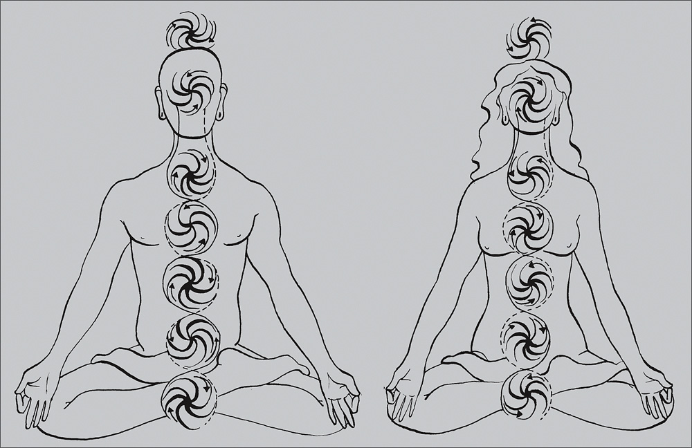 Todas las tradiciones, desde la china a la hindú, pasando por la céltica o la egipcia, reconocen la existencia de dos corrientes energéticas de las que depende la vida: la energía telúrica, la corriente femenina de la tierra —en el tantrismo, Shakti Kundalini— que recibimos a través del chakra de la raíz, Muladhara y alojamos, en forma de serpiente enrollada, en la base de la columna; y la energía cósmica, la corriente masculina del cielo —en el tantrismo, Shiva—, que captamos gracias al chakra de la corona, Sahasrara.