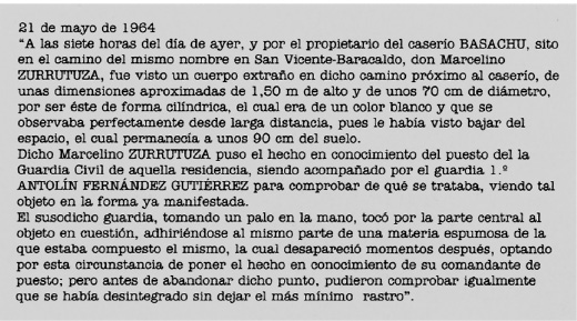 Marcelino Zurrutuza, agente de la Policía Municipal de Baracaldo, regresaba al hogar dando su habitual paseo diario. Vivía en un viejo caserío situado en el camino de la colonia de San Vicente, a varios kilómetros de la ciudad vizcaína. Poco antes de llegar, observó la caída a tierra de un artefacto blanco luminoso. Aquel día no pudo entrar en la casa. Junto a ésta, un extraño objeto con forma de cilindro permanecía estático sobre el frío asfalto cortándole el paso: era un aparato de aproximadamente un metro y medio de alto por setenta centímetros de diámetro. Presa del pánico, acudió al cuartel de la Benemérita más próximo, el de San Vicente. Cincuenta minutos más tarde, el guardia civil Antolín Fernández Gutiérrez se personó en el lugar de los hechos junto al primer testigo de los mismos. La reacción del número fue coger un palo del terreno y golpear levemente el enigmático aparato, que mostraba a su alrededor una espesa materia espumosa. A cada roce de la madera, la masa que formaba el ovni se contraía, como si tuviera algún tipo de sensibilidad. Minutos más tarde, el artefacto desaparecería sin dejar otro rastro de su presencia en el lugar que los rostros anonadados de los dos sorprendidos testigos. Al día siguiente, la Comandancia de la Guardia Civil redactaba uno de los primeros informes ovni en este país.