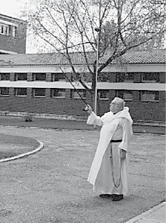 Foto 3.6.—El padre Antonio Felices, en el patio de Arcas Reales (Valladolid), mismo escenario desde donde se observó el «triángulo de Castilla». (Iker Jiménez.)