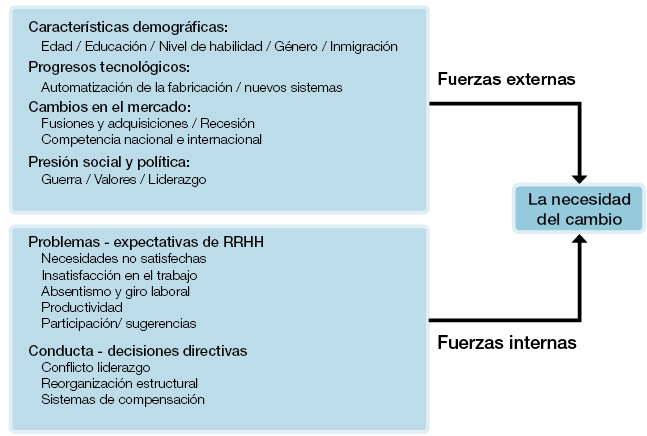 En el siguiente cuadro pueden verse la interacción necesaria entre las fuerzas internas y externas del cambio: