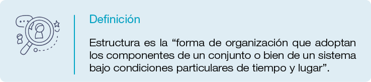 Por ello, se dice que existe una estructura cuando una serie de elementos se integran en una totalidad que presenta propiedades específicas como un conjunto y cuando, además, las propiedades de los elementos dependen (en una medida variable) de los atributos específicos de la totalidad. De hecho, para Tamames (1975), “la estructura es la caracterización de un todo por las relaciones mutuas que implican la distribución y el orden de sus partes”.