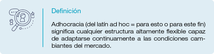 Los empleados tienen que ajustarse a las necesidades de sus clientes (adhocracia operativa) o las suyas propias (adhocracia administrativa), sin conceder el más mínimo espacio a las rigideces. Por tanto, esta estructura es la más adecuada, para aquellas organizaciones que necesiten un alto nivel de innovación y deban combinar equipos interdisciplinares de expertos en proyectos muy variables entre sí, ya sea por su duración o por el contenido mismo.