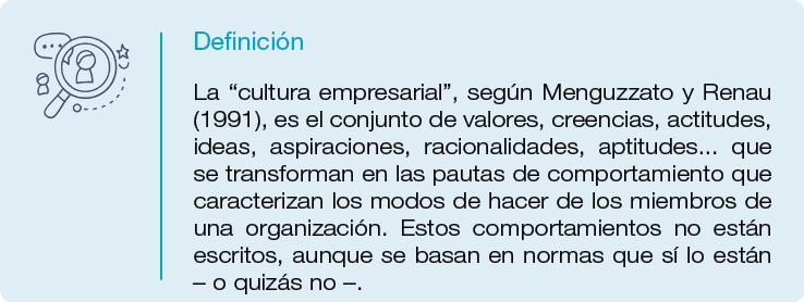 En otras palabras, la cultura “homogeiniza las conductas personales y refuerza, de manera implícita, el sistema de reglas y la configuración del poder: cultura y estructura se refuerzan mutuamente y condicionan la forma en que se toman las decisiones y se ejecutan las acciones en la organización”. Y siempre – absolutamente siempre – existe, aunque no haya una formulación oficial y explícita de la misma. Si una organización no se preocupa de definir su cultura-objetivo y de encauzar sus esfuerzos en esa dirección, los empleados – de todos los niveles – deducirán por su cuenta cuáles son las pautas de conducta adecuadas en ese entorno: “Aquí las cosas se hacen así”, “Aquí el que manda es Don Fulano, o el departamento tal”, “Si quieres lograr algo dirígete directamente a tal persona”, etc.