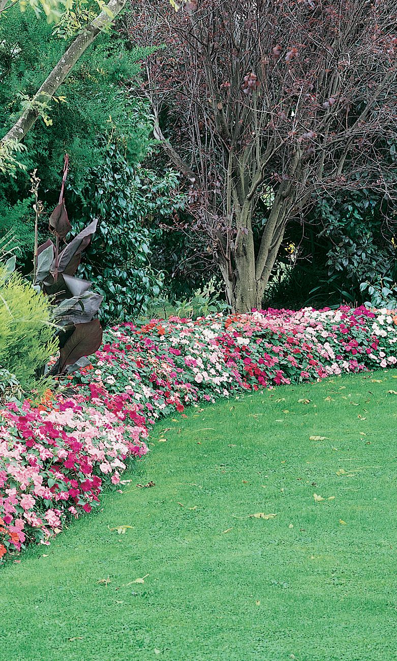 La bordura de Impatiens destaca sobre el verde del césped. Fotografías de ©Maxi Media Italia - 2000