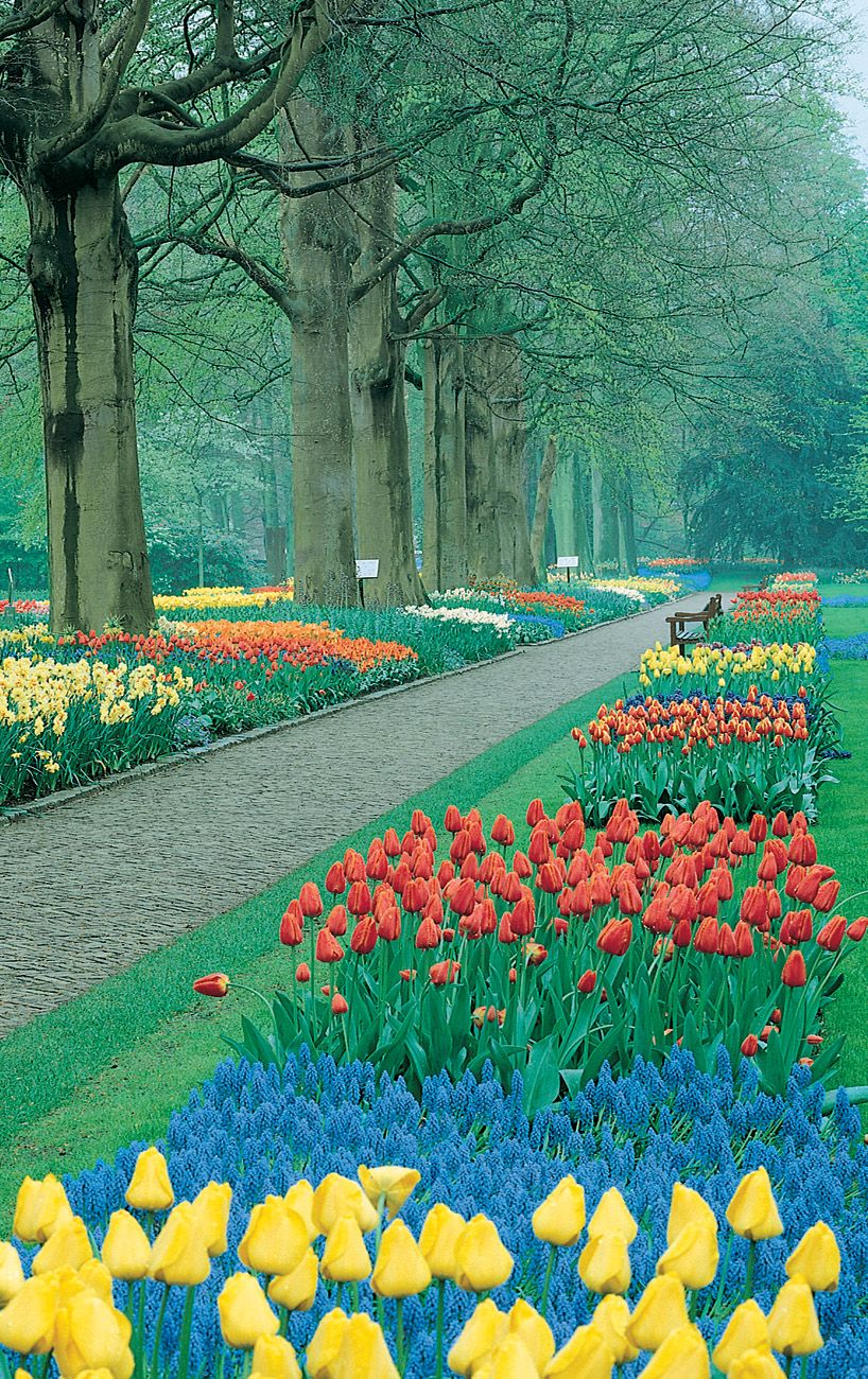 Tulipanes y narcisos bordean el sendero de un parque. Fotografías de ©Maxi Media Italia - 2000