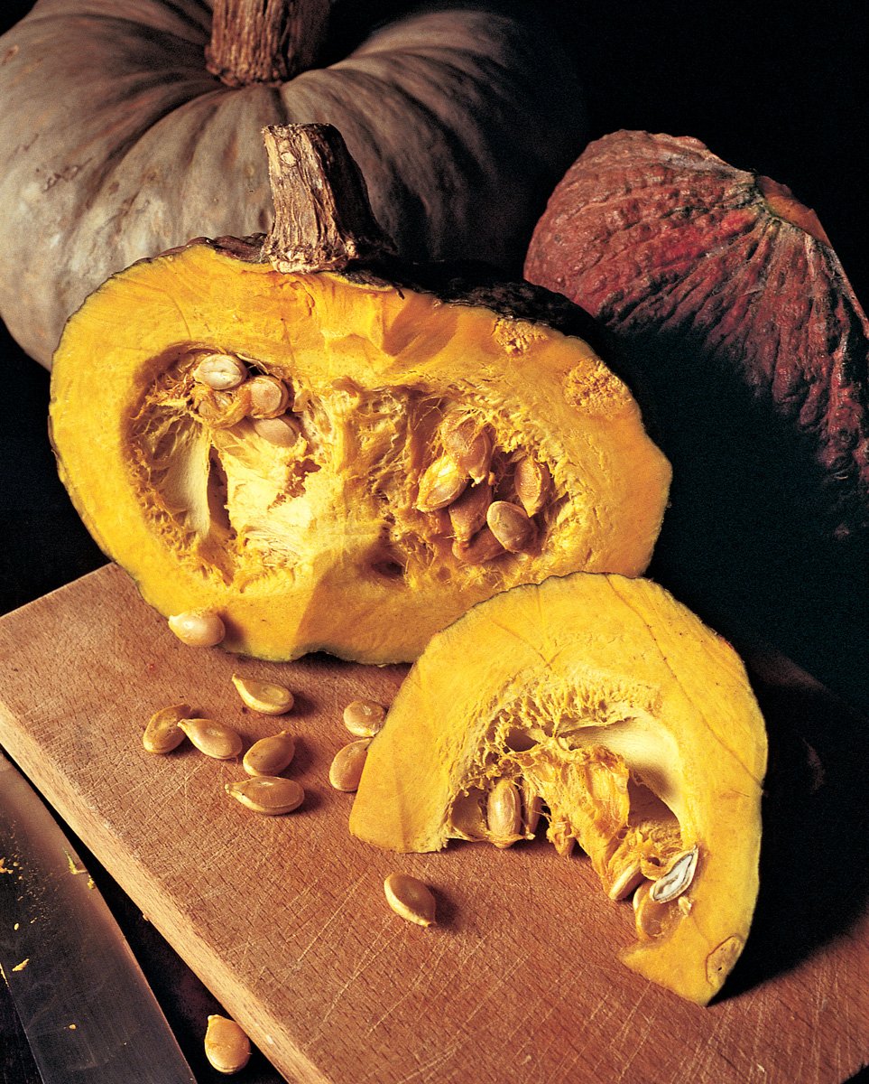 En el interior de la fruta madura, la pulpa es fina, lisa y de un anaranjado brillante muy bello, que únicamente cambia en la zona próxima a la corteza, donde tiene una textura más coriácea. En el centro del fruto se encuentran las semillas, dispuestas de forma paralela a su eje: son ovaladas, planas, grandes y lisas, de color blanco o amarillo pálido, y suelen presentar una marca alrededor de todo el margen. Estas semillas, utilizadas para el cultivo posterior, así como para el consumo humano tras un ligero tueste, pesan de 3 a 7 g por unidad, según la variedad. La capacidad de germinación suele tener una duración de 3 a 5 años, periodo de tiempo relativamente largo.