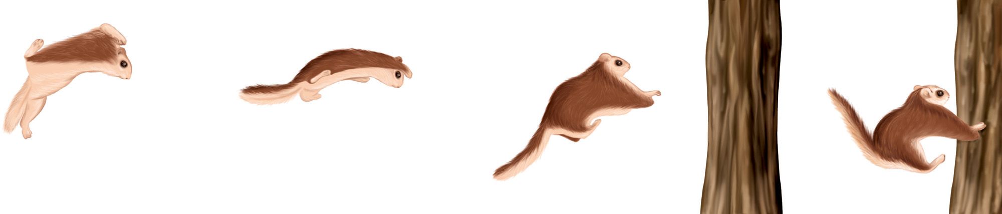 Lamentablemente no es fácil verlas, porque durante el día duermen a pierna suelta. Por la noche inician su actividad frenética, que consiste en comer, beber, jugar y, naturalmente, volar. De esta forma se exhiben en espectaculares vuelos de 40 o 50 m, virajes de 90°, vueltas de campana... Pueden hacerlo gracias a un pliegue de la piel, que se llama patagio, que se extiende desde el tobillo de las patas traseras hasta la muñeca de las delanteras. Cuando está a punto de volar desde lo alto de la copa de un árbol, la ardilla abre los brazos para que el patagio quede bien tenso, exactamente como las alas de un planeador.