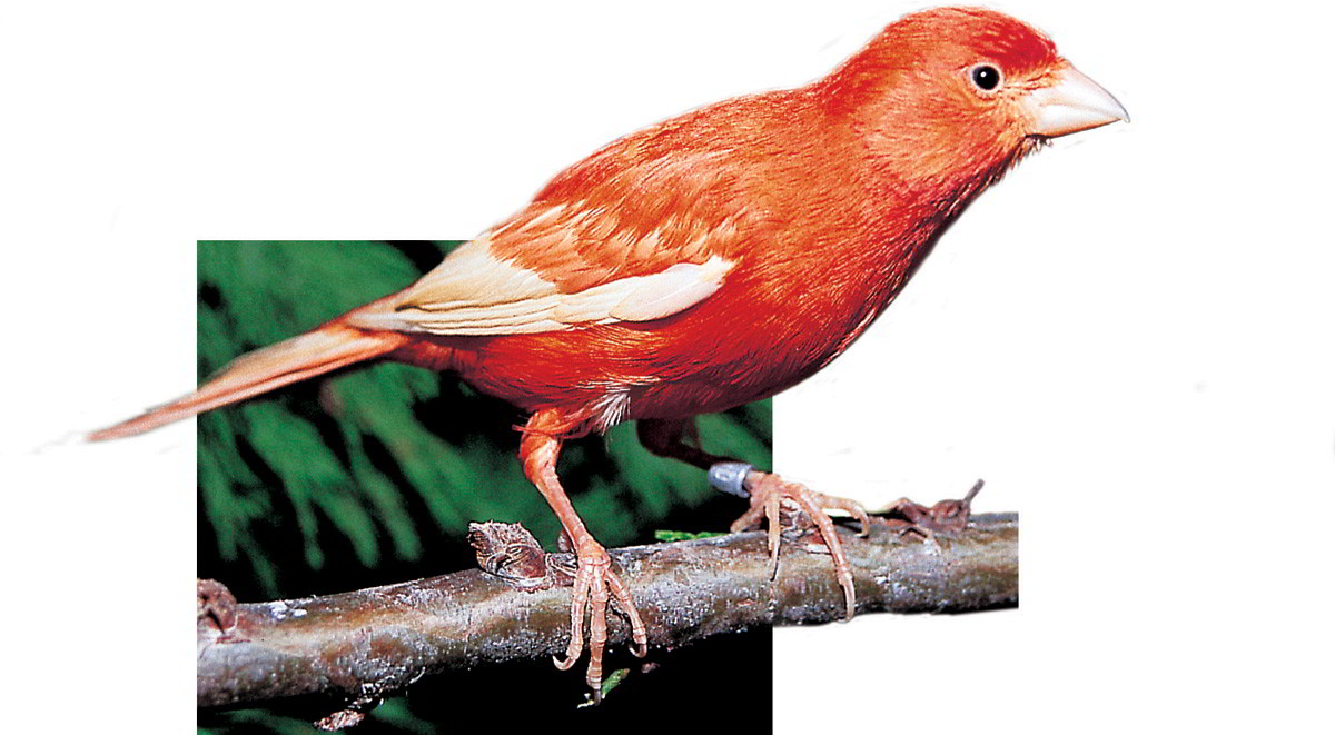 Bonito ejemplar de canario rojo intenso de alas blancas y, abajo:, un malinois en «posición de atención», es decir, ligeramente inclinado hacia adelante