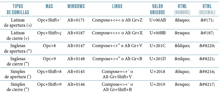 A pesar de que las recomendadas por la RAE son las angulares («»), lo cierto es que son las menos accesibles en el teclado de las computadoras u ordenadores, a diferencia de las dobles, que se encuentran en la misma tecla que el número 2, o las simples, que comparten la tecla del signo de cierre de interrogación. Para obtenerlas se pueden emplear ciertas combinaciones de teclas en función del sistema operativo.