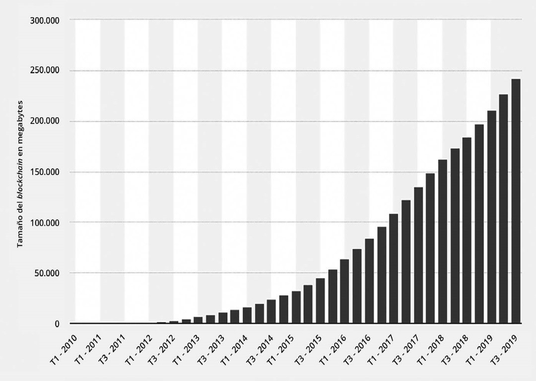 FIGURA 1-1 Tamaño del blockchain de Bitcoin en su primera década, de 2010 a 2019, por cuatrimestres (en megabytes).