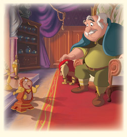 Unos sirvientes que habían sido hechizados y eran muy simpáticos dieron la bienvenida al hombre mayor, entre ellos un candelabro llamado Lumiere, un reloj de pared llamado Din Don, una tetera a la que llamaban señora Potts y su hijo Chip, una tacita.