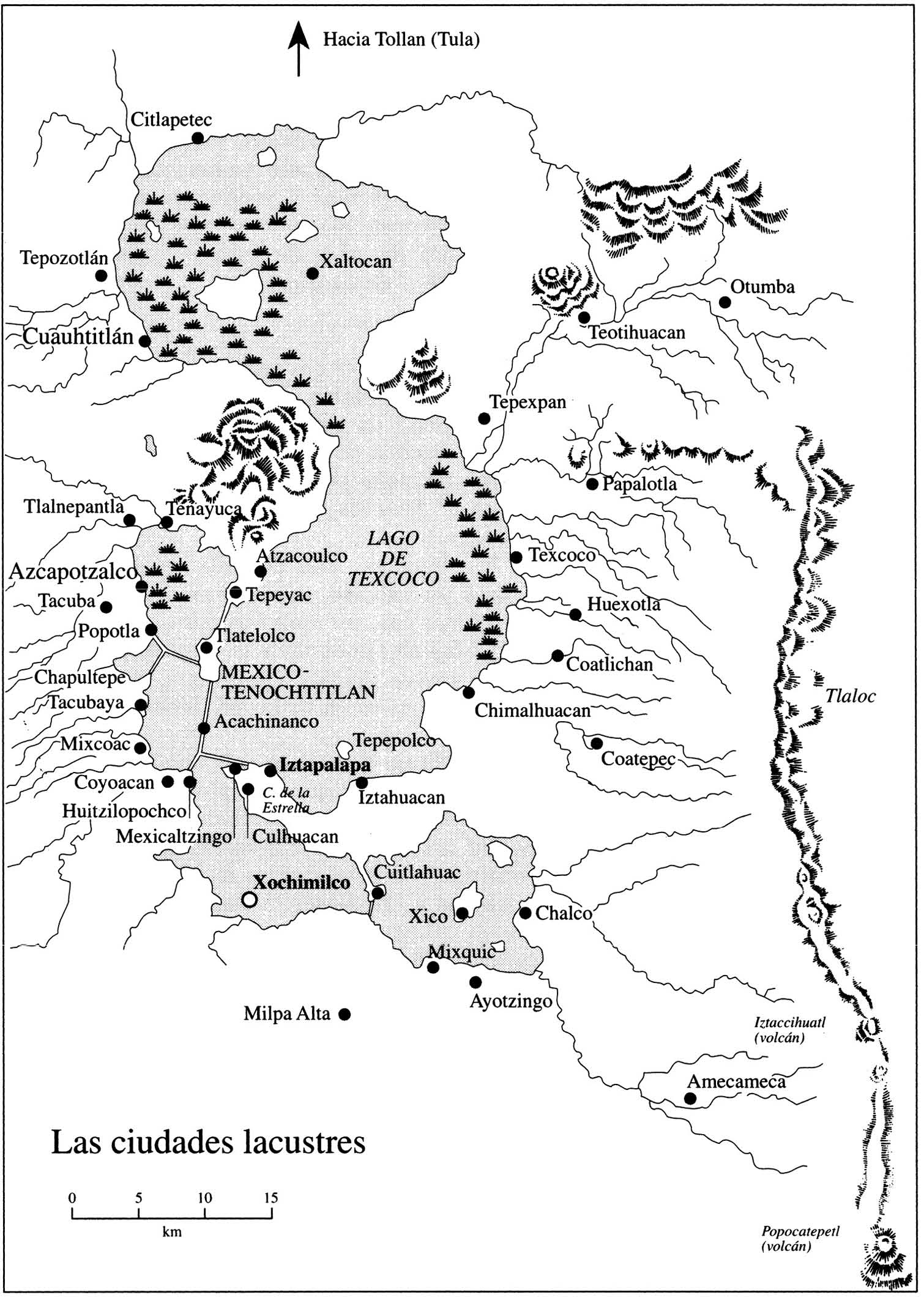 Durante noventa años, la seguridad de Tenochtitlan se sostuvo gracias a la alianza con otras dos ciudades, Tacuba y Texcoco, al oeste y al este del lago, respectivamente. Ambas eran satélites de Tenochtitlan. Texcoco, la capital de la cultura, era formidable por derecho propio: allí se hablaba una elegante versión del idioma del valle, el náhuatl. Tacuba era diminuta: contaría con unas ciento veinte casas.7 Ambas obedecían al emperador de los mexicas en cuanto a los asuntos militares. Por lo demás, eran independientes. Ambas casas reales —no hay razón para no llamarlas así— tenían lazos de sangre con la de Tenochtitlan.8