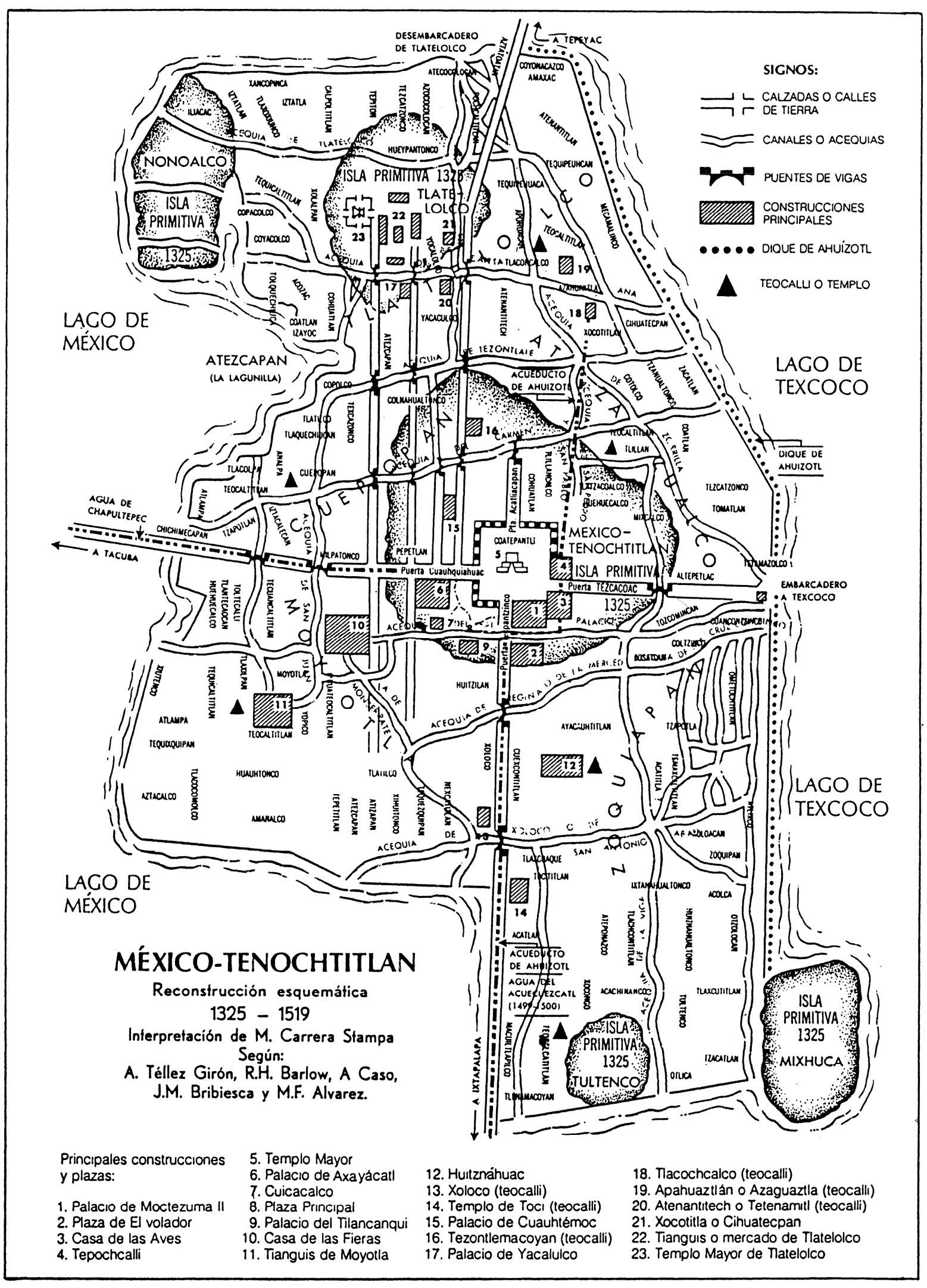 Al igual que Venecia, ciudad con la que se la compararía frecuentemente, la edificación de Tenochtitlan requirió varias generaciones.2 Sus habitantes habían extendido la diminuta isla natural formando un terraplén artificial de unas mil hectáreas, llenando de fango y rocas huecos cercados con estacas. En Tenochtitlan había unos treinta elegantes y altos palacios construidos con una piedra volcánica rojiza y porosa.3 Las casas más pequeñas, de una sola planta, en las que vivían los aproximadamente doscientos cincuenta mil habitantes, eran de adobe y pintadas generalmente de blanco.4 Puesto que se encontraban sobre plataformas, muchas de ellas estaban protegidas contra las inundaciones. El lago rebosaba de canoas de distintos tamaños que transportaban tributos y bienes comerciales. Sus orillas estaban salpicadas de pequeñas ciudades bien planeadas que debían lealtad a la gran ciudad del lago.