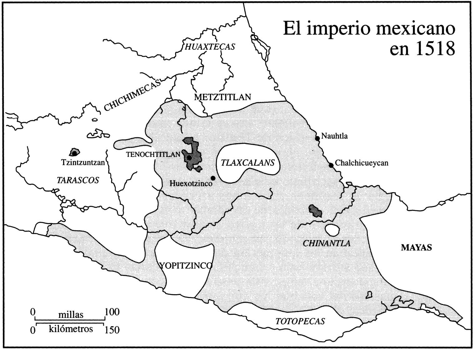 Incluso en el valle, muchos lugares habían sido independientes del imperio mexica, según recordaban testigos contemporáneos: por ejemplo, Chalco, al este del lago y antaño centro de un pequeño imperio, compuesto de veinticinco ciudades, no sucumbió ante los mexicas hasta 1465. Una característica aparentemente tan tradicional como el traje de guerra acostumbrado databa apenas de la victoria del emperador Axayácatl en la región huaxteca en los años setenta del siglo XV.2