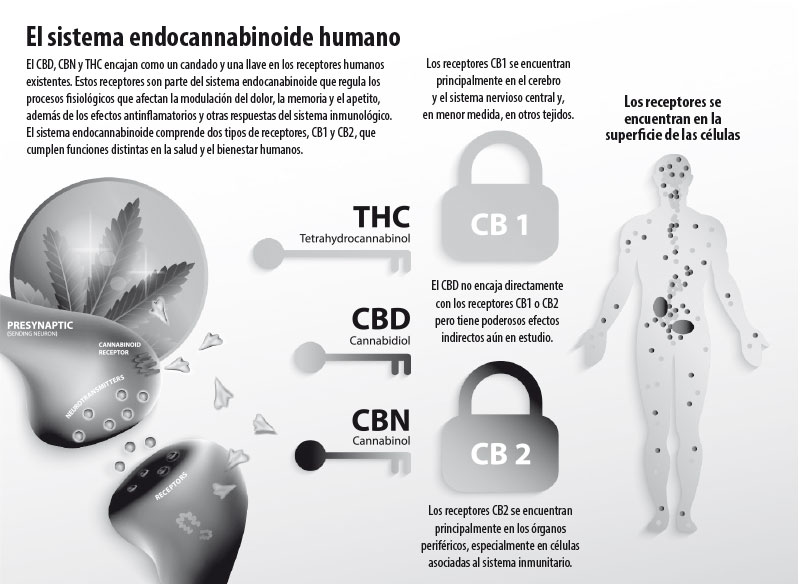 El CBD no encaja perfectamente con los receptores CB1 o CB2, pero tiene un poderoso impacto indirecto en estos receptores. La interactuación del CBD con los receptores CB1 y CB2 todavía es objeto de estudio.