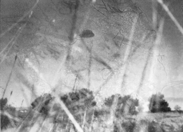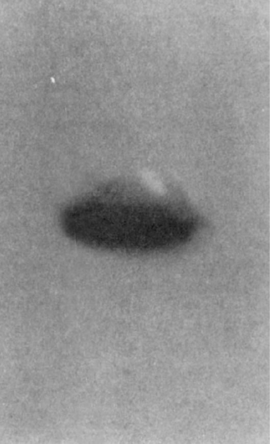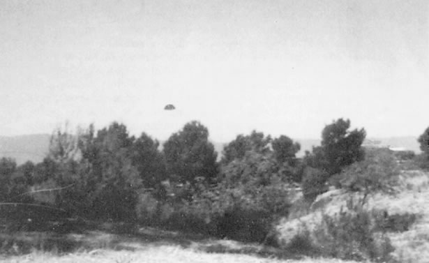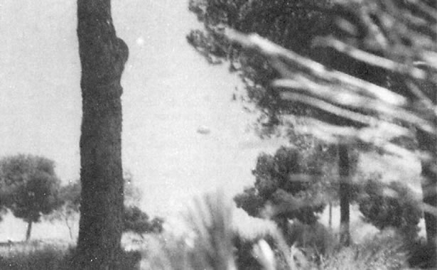 Segundo documento. La luz del sol refleja en la parte superior del ovni. Los expertos en fotografía han observado en esta toma una curiosa circunstancia, difícil de resolver en un trucaje. Mientras la cámara parece correctamente enfocada a infinito, con las ramas situadas en primer plano lógicamente desenfocadas, el objeto presenta una anómala distorsión. En principio, dado que el reflejo solar se halla bien definido, cabe la posibilidad —como simple hipótesis— de que lo que rodea el objeto sea humo, niebla o algún tipo de fluido elástico. En el supuesto de que la distorsión se debiera al propio movimiento del ovni, el problema se complicaría ya que, como digo, la imagen presenta un enfoque correcto.