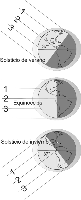 En la Figura 1, en el solsticio de verano del hemisferio norte se observa la incidencia de los rayos del Sol (líneas 1, 2 y 3) El recorrido marcado con de la línea 1 es tangencial dentro de una atmósfera más delgada y cercana al polo norte en donde está su menor grosor; El del rayo número 2 corresponde a la línea imaginaria que une los centros del Sol y la Tierra y que de la misma manera atraviesa la atmosfera un poco más gruesa que la anterior y sus rayos caen verticalmente sobre el piso, circunstancias que producen altas temperaturas que últimamente han llegado a sobrepasar los 40° C.