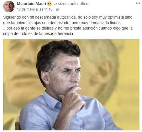 Por otra parte, también podríamos relacionarlo con la fanpage en Facebook Prol. Humor Gráfico,6 en la que, asimismo, se efectúa una satirización del exmandatario destacando la insensibilidad social y la crueldad con la que se planificarían sus medidas de gobierno, así como, mediante procedimientos de intensificación gráfica, el color celeste de sus ojos, que han sido tematizados en las redes sociales como garantía de transparencia y honestidad por parte de partidarias y partidarios de Macri.
