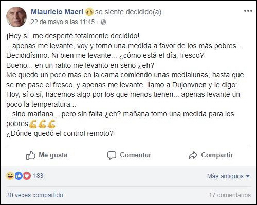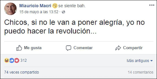En cambio, hay publicaciones que consisten en compartir contenidos provenientes de otras páginas –que generalmente son también contrarias al gobierno de Mauricio Macri–, y así reproducen, o bien memes opuestos al presidente, o bien injurias dirigidas hacia su persona. En este último caso, muchas de las intervenciones consisten en enunciados que contienen acusaciones de distinto tipo, las que se efectúan bajo lo que podríamos caracterizar como el pathos de la ira, el que se expresa en el uso recurrente de insultos, exclamaciones y mayúsculas; tales publicaciones no suelen recibir ningún tipo de respuesta, sea por parte de otros usuarios, sea por los administradores de la página. Si bien en ellas se rompe el modo de lectura irónico –por lo que se puede pensar que existe una confusión con el sitio oficial–, estas modalidades de participación, junto con la gran cantidad de comentarios que celebran la reapertura de la página, permiten dar cuenta de una alta adhesión ideológica que también se expresa de manera humorística, aunque en menor cantidad que en los comentarios, como observaremos en el análisis que a continuación encaramos.