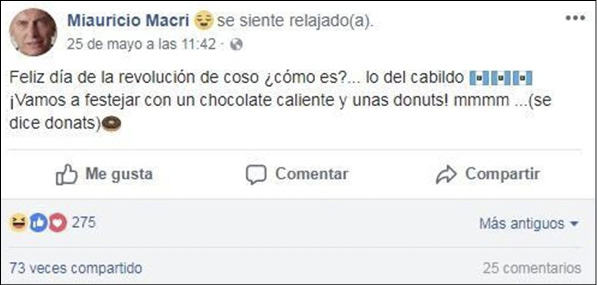 En el caso de la figura 3, el personaje evidencia, como es fácil advertir, un flagrante desconocimiento de una de las principales fechas patrias del país, la Revolución de Mayo, recordando solamente el edificio emblemático en el que tuvo lugar y poniendo en su lugar banderas argentinas. Además, sustituye a los churros como factura “representativa” de esta celebración y los reemplaza por unas donuts, típicas de la cultura estadounidense, aclarando además su verdadera pronunciación en inglés. El conjunto de operaciones genera, claramente, un efecto contrario al espíritu patrio de la fecha.