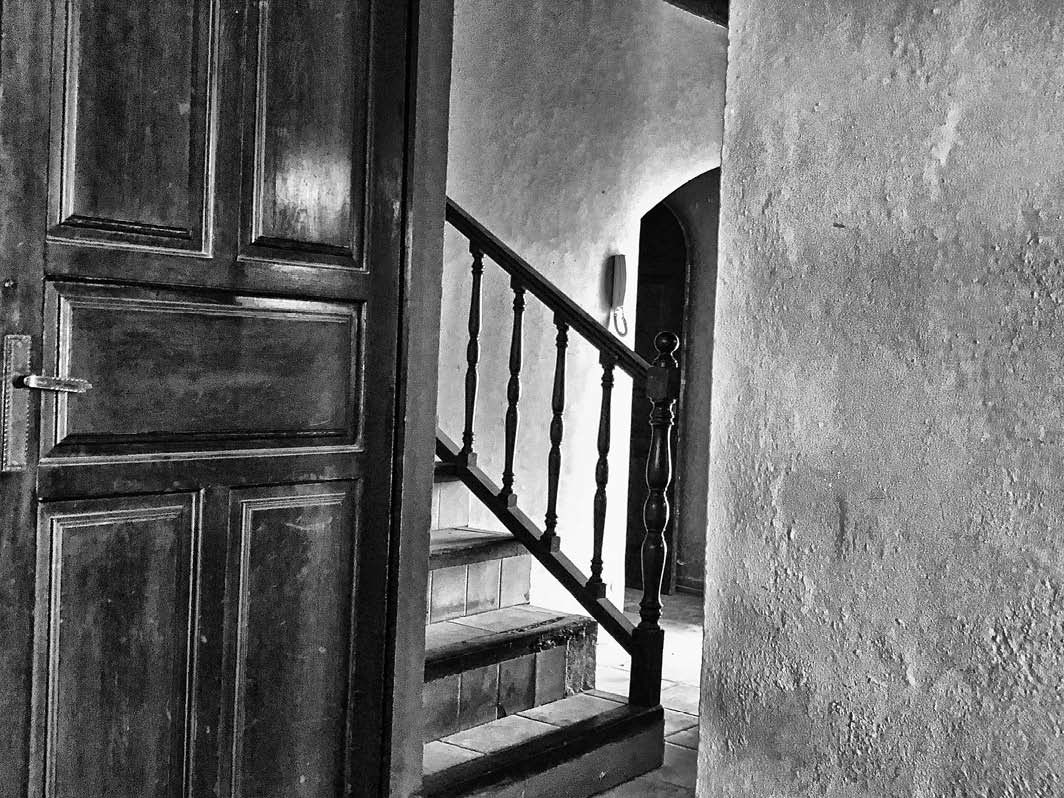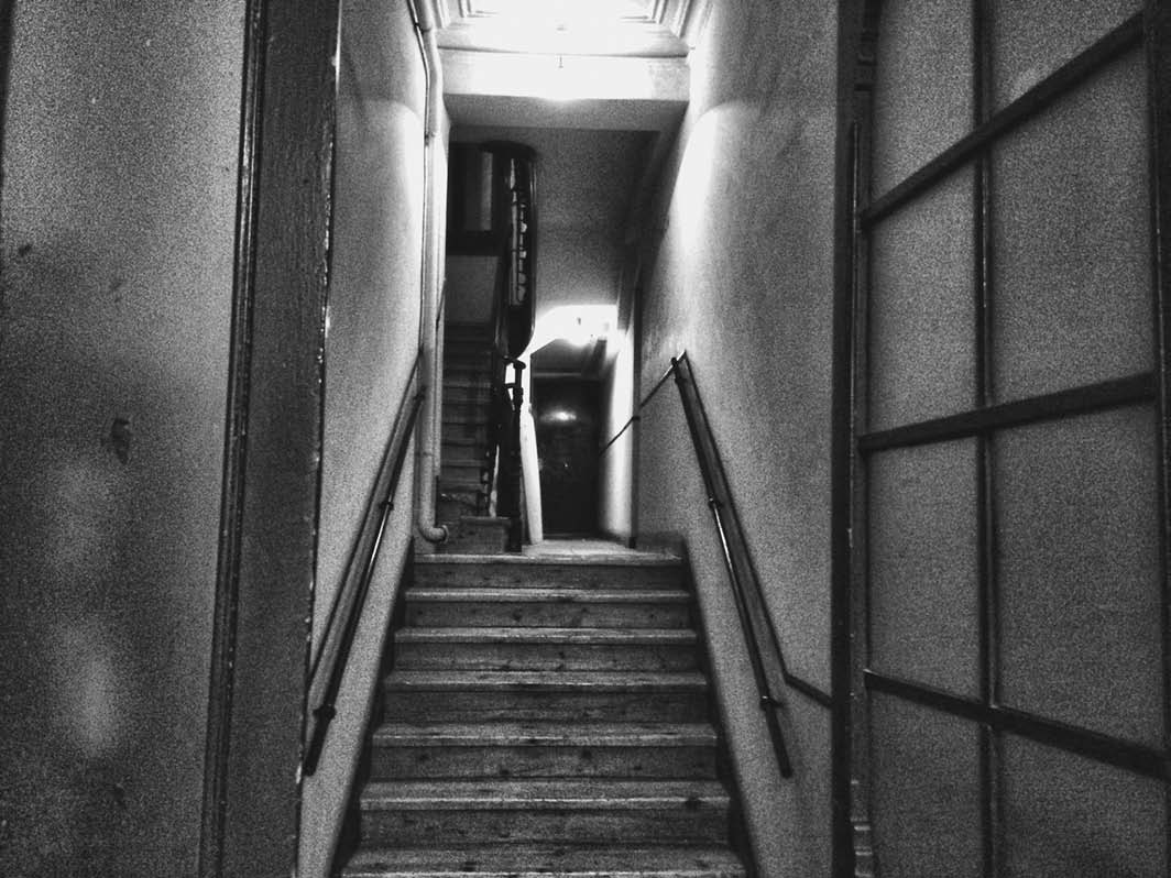 Empujé con fuerza y entré. Me topé con un portal estrecho, que, francamente, no se parecía demasiado al de mi sueño. Después de atravesar un espacio diáfano, una inclinada escalera de madera ocupaba prácticamente todo el pasillo.