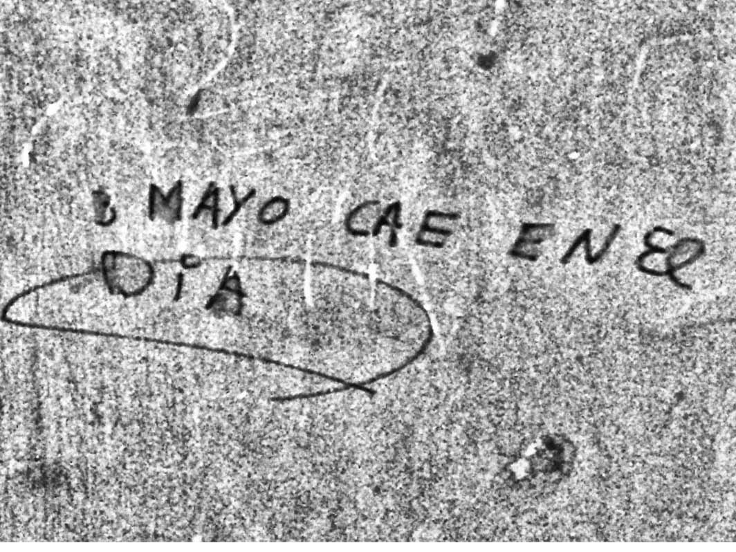 Antes de marcharnos, precisamente Clara se dio cuenta de otro detalle. Me llamó para comprobarlo. En la cocina había una inscripción. Una frase escrita con una tipografía mayúscula sobre el hormigón de la pared, bajo las capas del papel grasiento que pendía de los muros. «3 MAYO CAE EN EL DÍA», decía. La palabra «DÍA» aparecía enmarcada, como si quien hubiera escrito aquello le hubiera dado especial importancia.