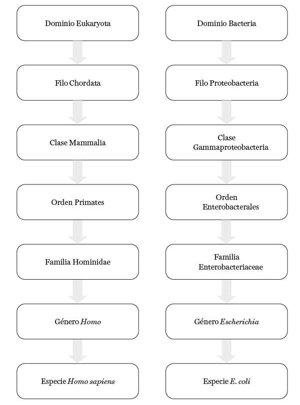 En la figura 2 verás la taxonomía simplificada del humano y la completa de una bacteria superfamosa: E. coli.