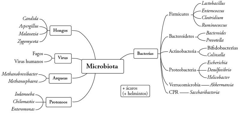 Las bacterias, claro; son las más conocidas. También arqueas, unas bacterias ultrapequeñas llamadas CPR, protozoos, hongos e incluso pequeños animales como los ácaros de la piel. Estos ácaros, en realidad, no son microorganismos y no se consideran microbiota en sentido estricto; al igual que los gusanos, que suelen ser parásitos por definición.