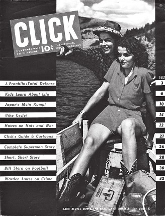 Solo unos meses después de que se publicara el artículo de Trotski sobre Tanaka, la revista Click lanzó su número de noviembre de 1941. Click, publicada en Filadelfia, era una revista de moda y cotilleos que solía mostrar en sus portadas a mujeres en bañador. Ese mes de noviembre, en la portada aparecía Jane Russell vestida con un mono rojo corto, mirando aparentemente el anuncio en primera plana de lo que Click llamaba «el Mein Kampf japonés».13