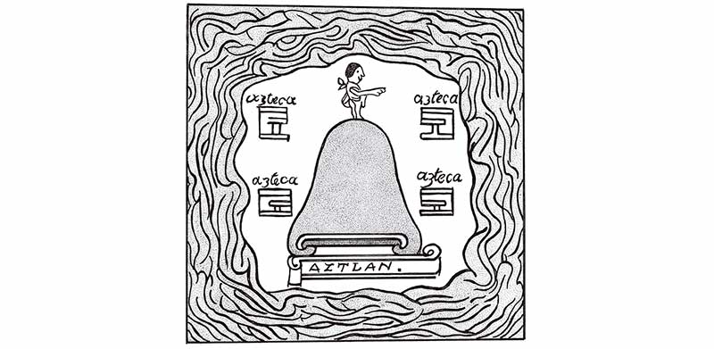 En la primera lámina de la Tira de la Peregrinación se ve la isla de Aztlán con un templo en el centro y a los lados seis casas que se refieren a las tribus o barrios que la poblaban. A la derecha un personaje en una canoa indica el abandono de la isla en la fecha 1 técpatl (1 pedernal), bajo la guía del dios patrono del grupo, Huitzilopochtli. Las huellas de pies señalan que los viajeros han llegado al lugar de la montaña torcida del lado derecho, en cuyo interior hay una enramada, bajo la que se advierte la cara del dios saliendo del pico de un pájaro. Las volutas que escapan de su boca sugieren que está hablando, transmitiendo su mensaje a la gente que ha dejado Aztlán e inicia una larga peregrinación. Las láminas siguientes narran ese periplo y muestran que éste se realiza bajo las señales y la autoridad de Huitzilopochtli.9