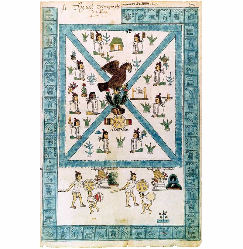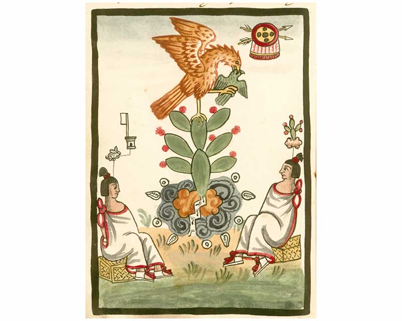 De manera que aquí es donde será, puesto que vimos lo que nos dijo y ordenó Huitzilopochtli. [Al día siguiente Huitzilopochtli llamó otra vez a los sacerdotes líderes y les dijo que volvieran a la parte de la laguna antes descrita, donde encontrarían un] tenochtli en el que veréis se posa alegremente el águila, la cual come y se asolea […], allí estaremos, dominaremos […] nos encontraremos con las diversas gentes […] con nuestra flecha y escudo nos veremos con quienes nos rodean, a todos los que conquistaremos, apresaremos, pues ahí estará nuestro poblado, México-Tenochtitlan, el lugar en que grita el águila, se despliega y come, el lugar donde nada el pez, el lugar donde es desgarrada la serpiente, México-Tenochtitlan.18