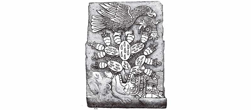 En el Museo Nacional de Antropología se conserva el monumento más antiguo que conocemos sobre la fundación de México-Tenochtitlan, llamado Teocalli de la Guerra Sagrada (figura 11). En él vemos un águila real parada en un nopal, el árbol heráldico, lanzando el grito de guerra que hizo famosos a los mexicas: atl tlachinolli, que quiere decir agua hirviente o quemada. El árbol emerge de la roca o corazón de Cópil, y sobre él se posa el águila.