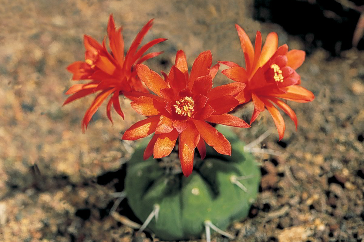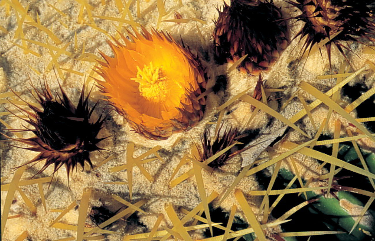 Las flores de los cactus de las zonas áridas son muy vistosas, ya que cuando brotan, después de un periodo más o menos largo de reposo obligado por las condiciones ambientales, tienen que atraer la atención de los insectos polinizadores. Se trata de flores diurnas, de colores brillantes, y que no están perfumadas.