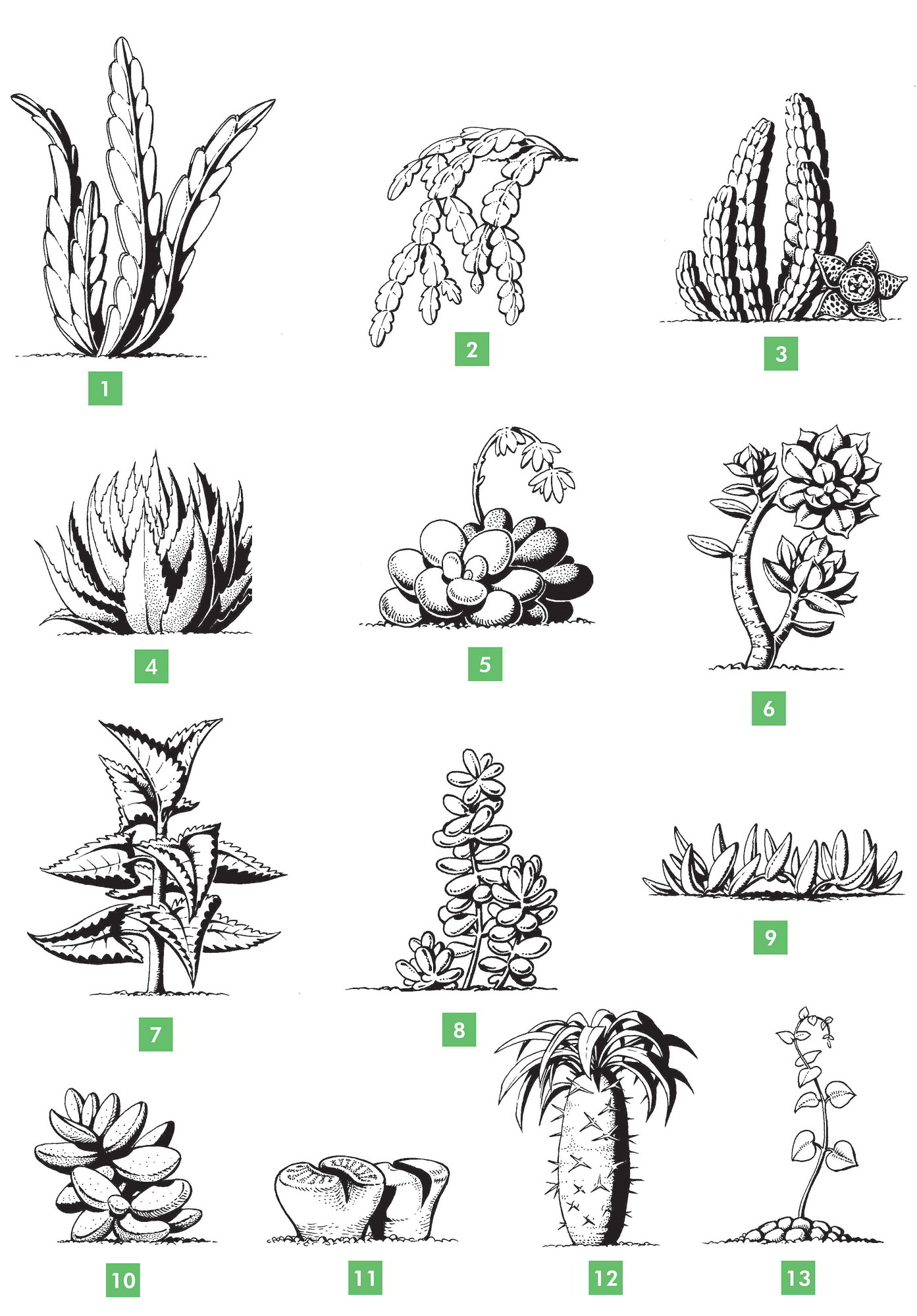 • Plantas con tallos abultados para almacenar agua, como Pachypodium (imagen 12), y otras que presentan abultamiento sólo en la base (imagen 13).