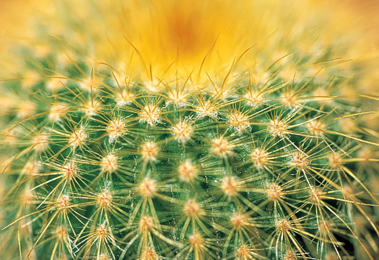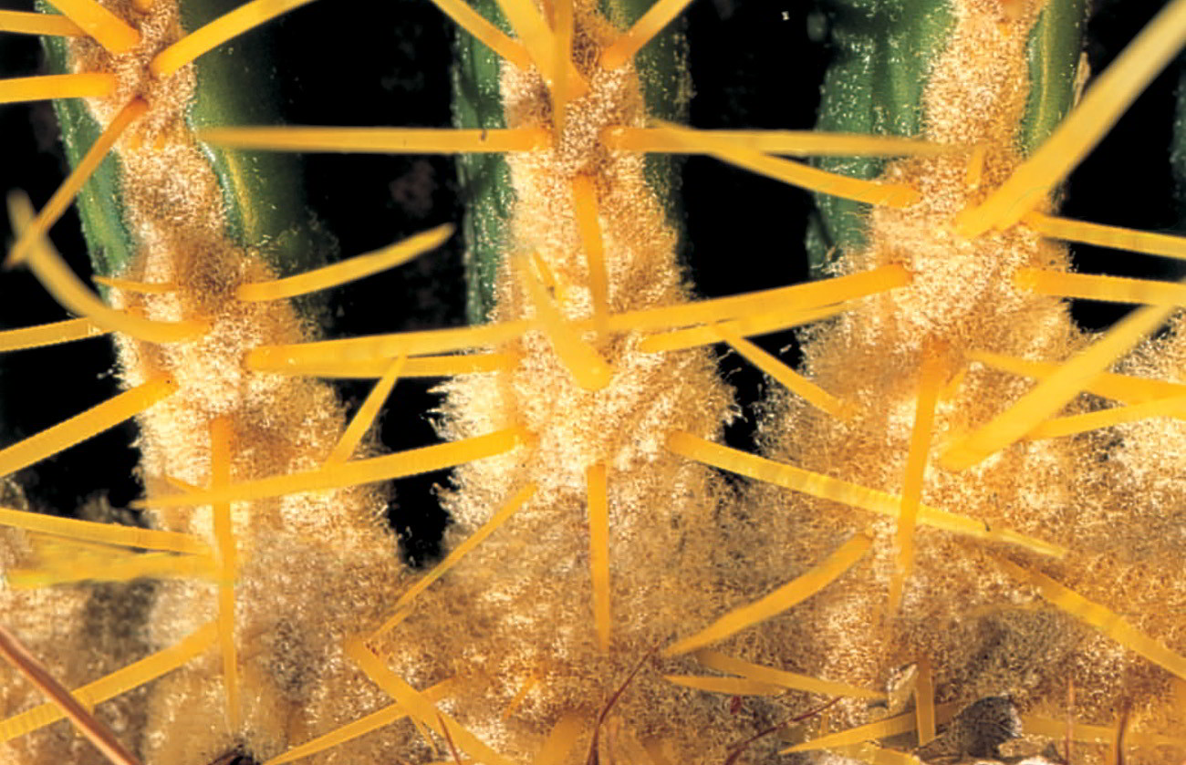 Espinas que en realidad son aguijones en Echinocactus grusonii; se aprecian perfectamente las areolas lanosas