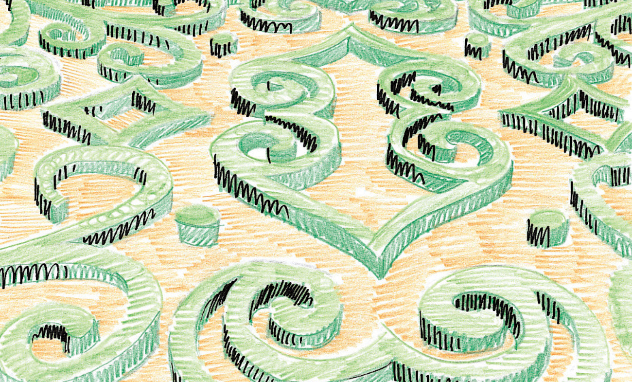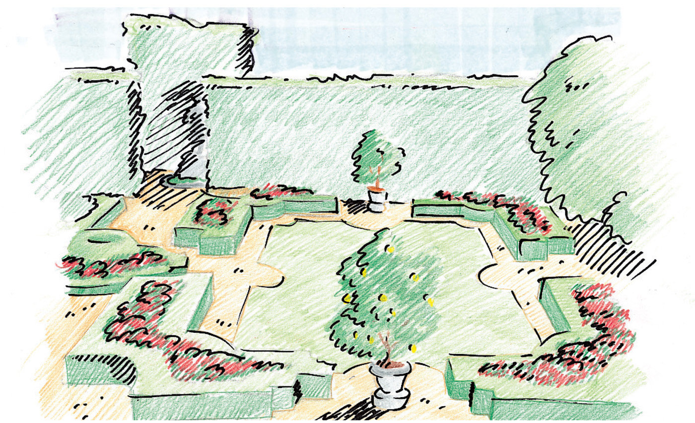 Formas onduladas y sinuosas creadas con setos de boj enano. (Dibujo de Damiano Groppi)