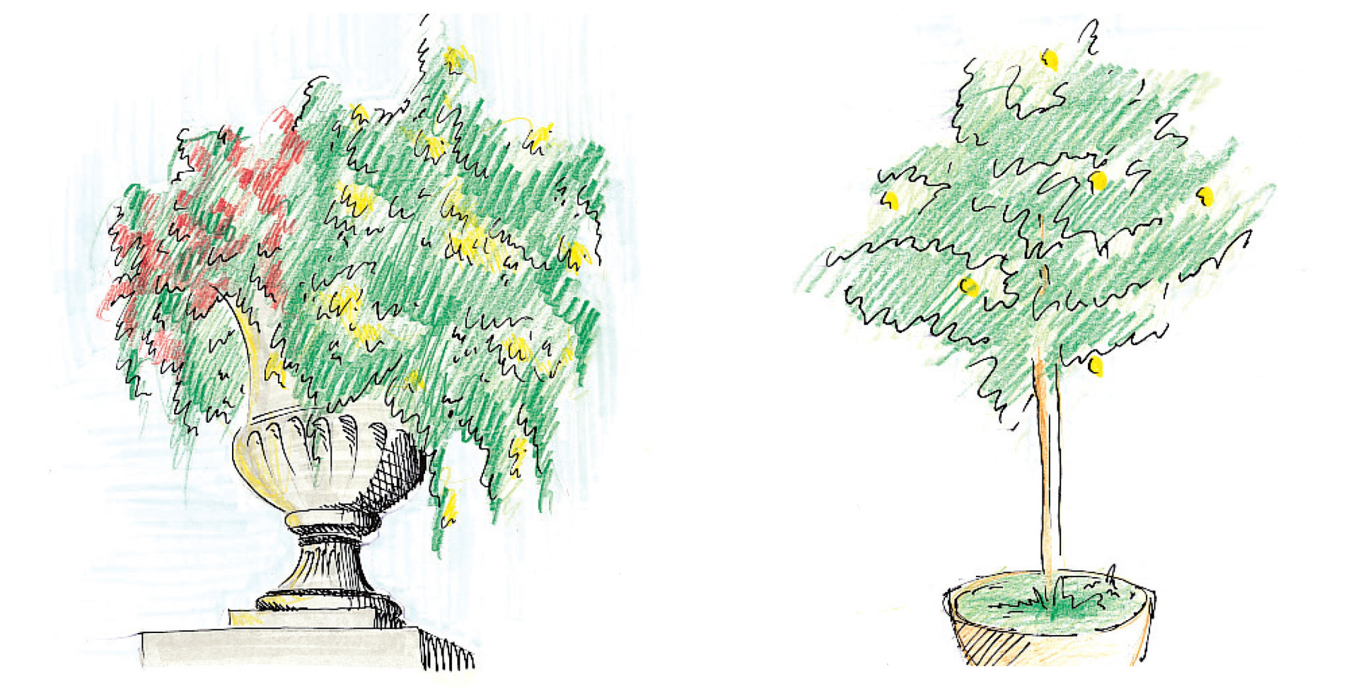 Las plantas de tallo alto, cultivadas en plena tierra, no deben alterar el diseño del conjunto. Por esta razón, suelen dejarse en la parte exterior del jardín, en donde forman bosques en los que se puede practicar la caza.