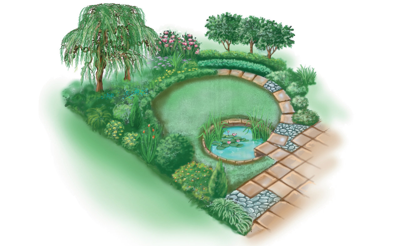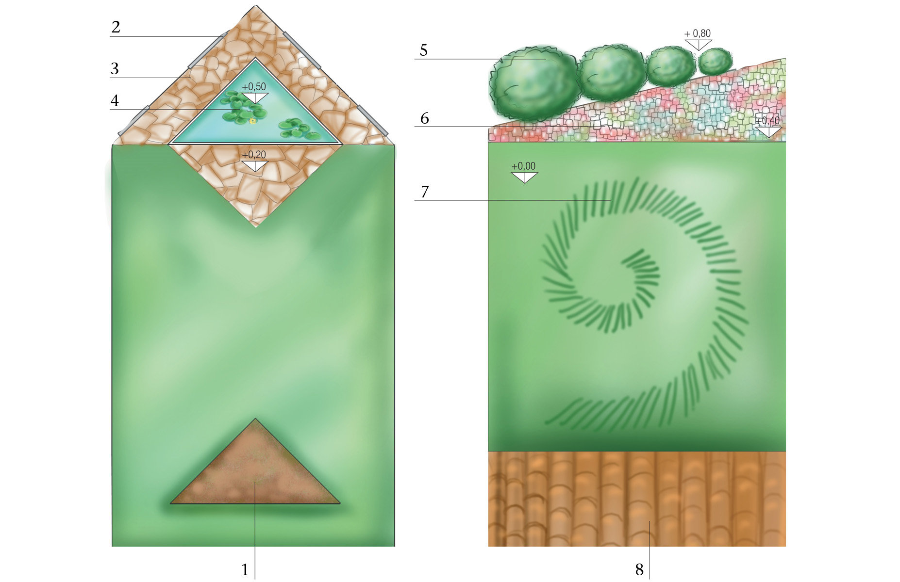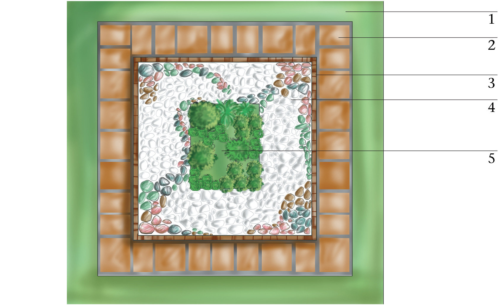 1. césped; 2. baldosas con cemento a la vista; 3. murete de ladrillo; 4. cantos de río policromos formando líneas onduladas; 5. plantas suculentas de diferentes alturas o estanque con peces o decoración con motivos estilizados