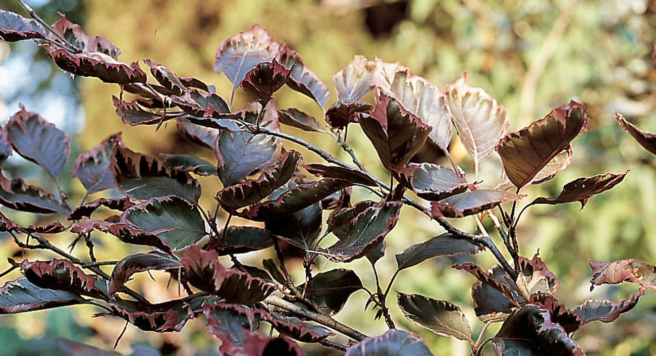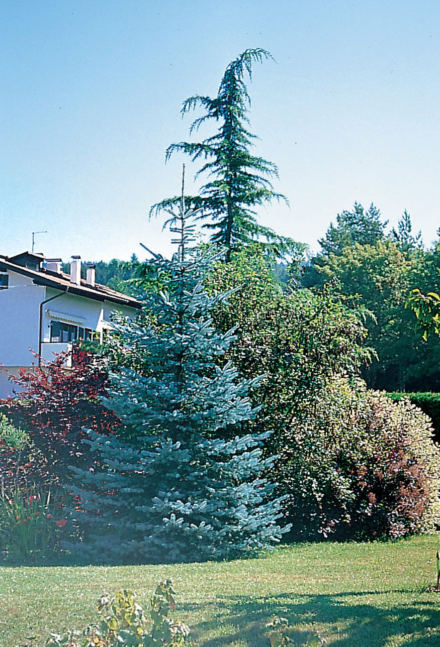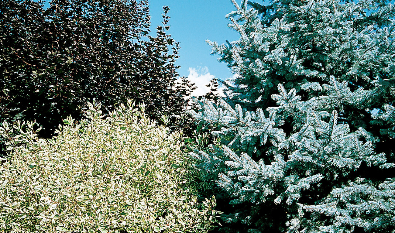 Ciruelo rojo, abeto plateado y arbusto de cinamomo forman una bella combinación cromática