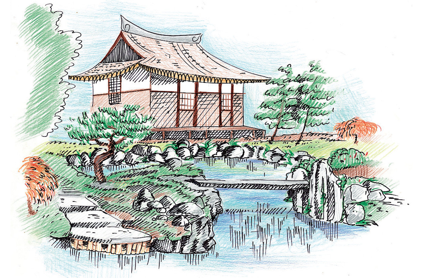 Clásico jardín japonés del templo de Jishoji. (Dibujo de Damiano Groppi)