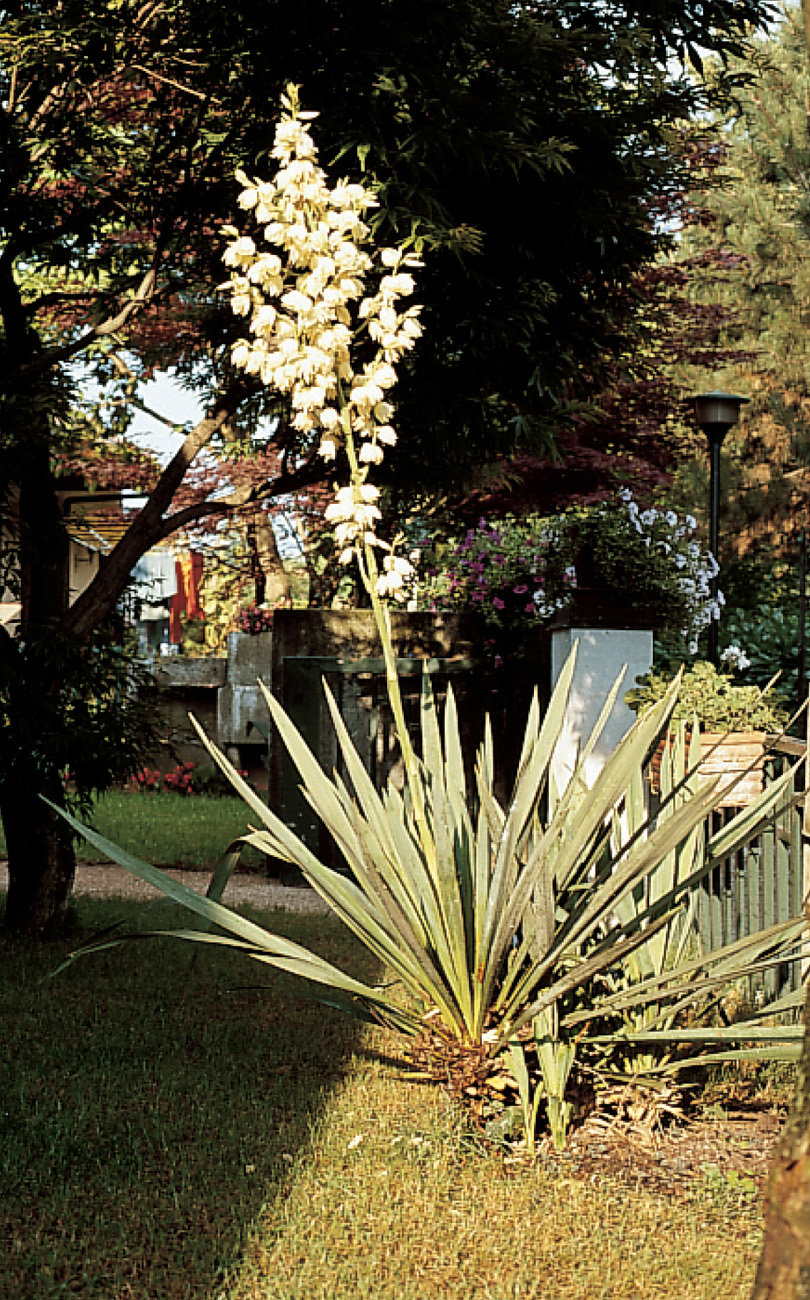 Ejemplar de yuca, una planta de hojas homogéneas y bien distribuidas que crea agradables contrastes con los accesorios del jardín