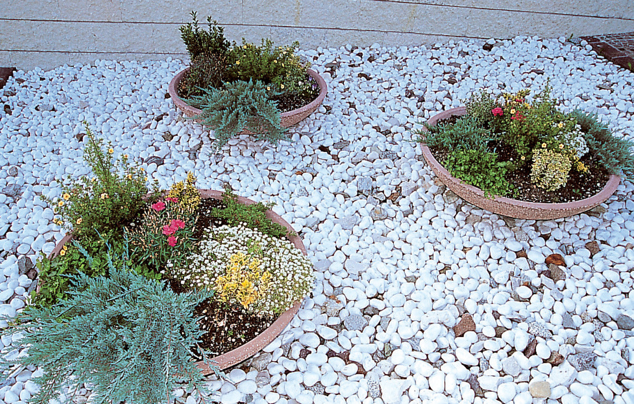 La grava blanca de los caminos se sustituye, a su vez, por piedras más coloreadas, no demasiado vivaces, pero elegantes, que sirven para formar otros bordados que se pueden contemplar desde las ventanas o las terrazas que se encuentren situadas por encima del jardín.