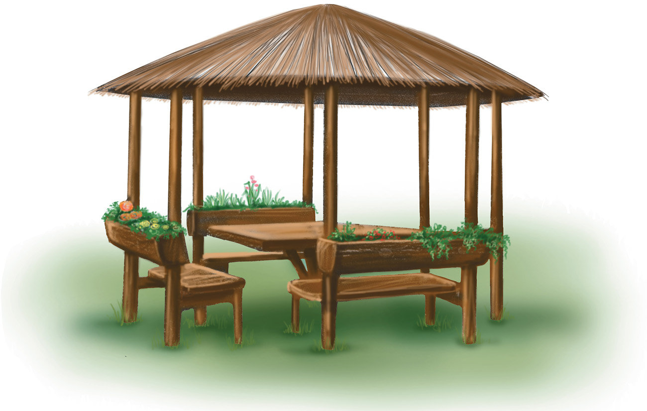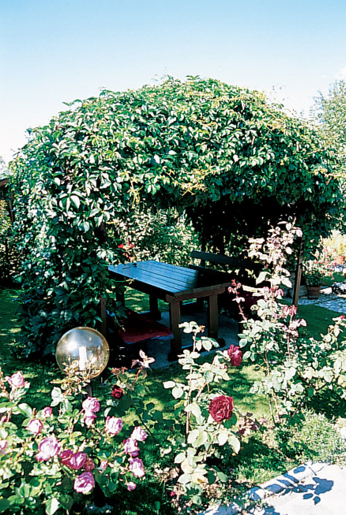 ♦ una zona de descanso, en un rincón resguardado, con asientos, bancos y otro mobiliario, bajo la sombra de un gran árbol, una pérgola o un emparrado.